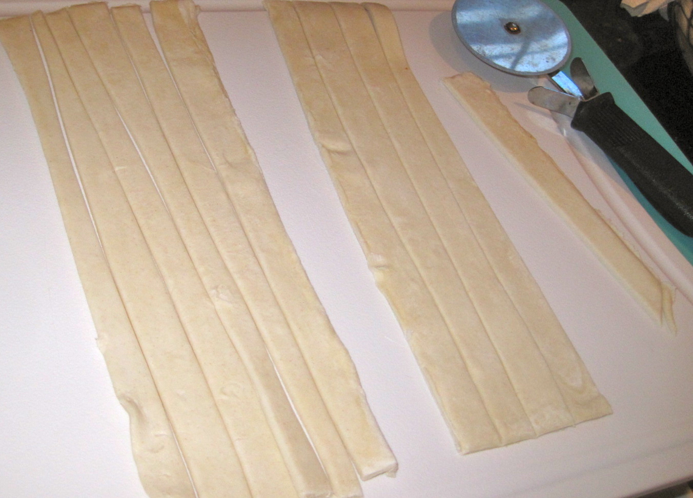 I cut the thawed puff pastry in thin strips with a pizza cutter