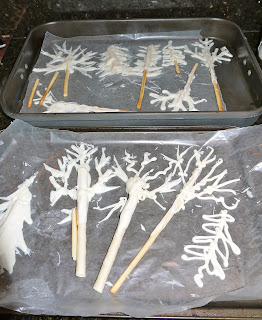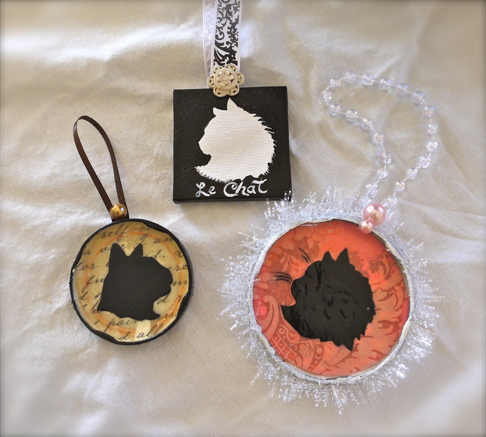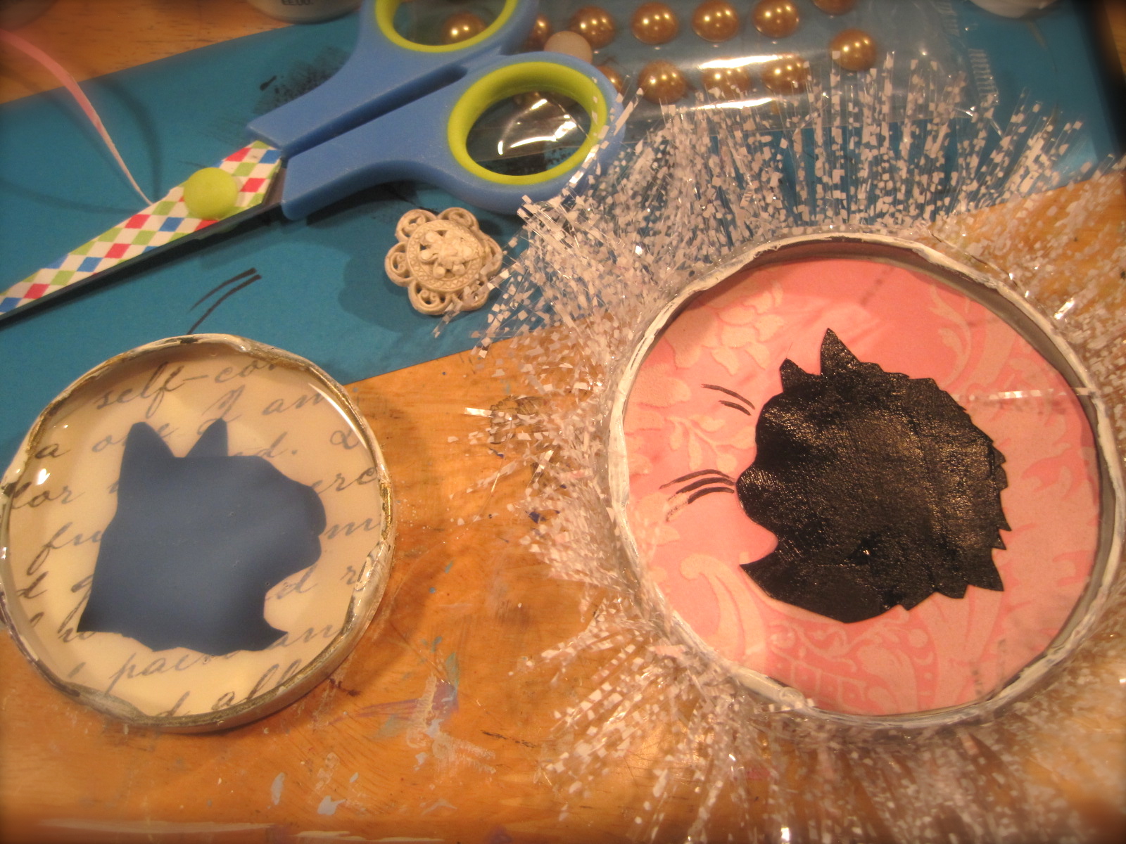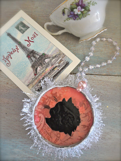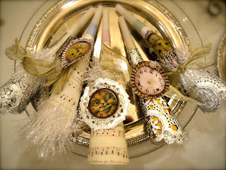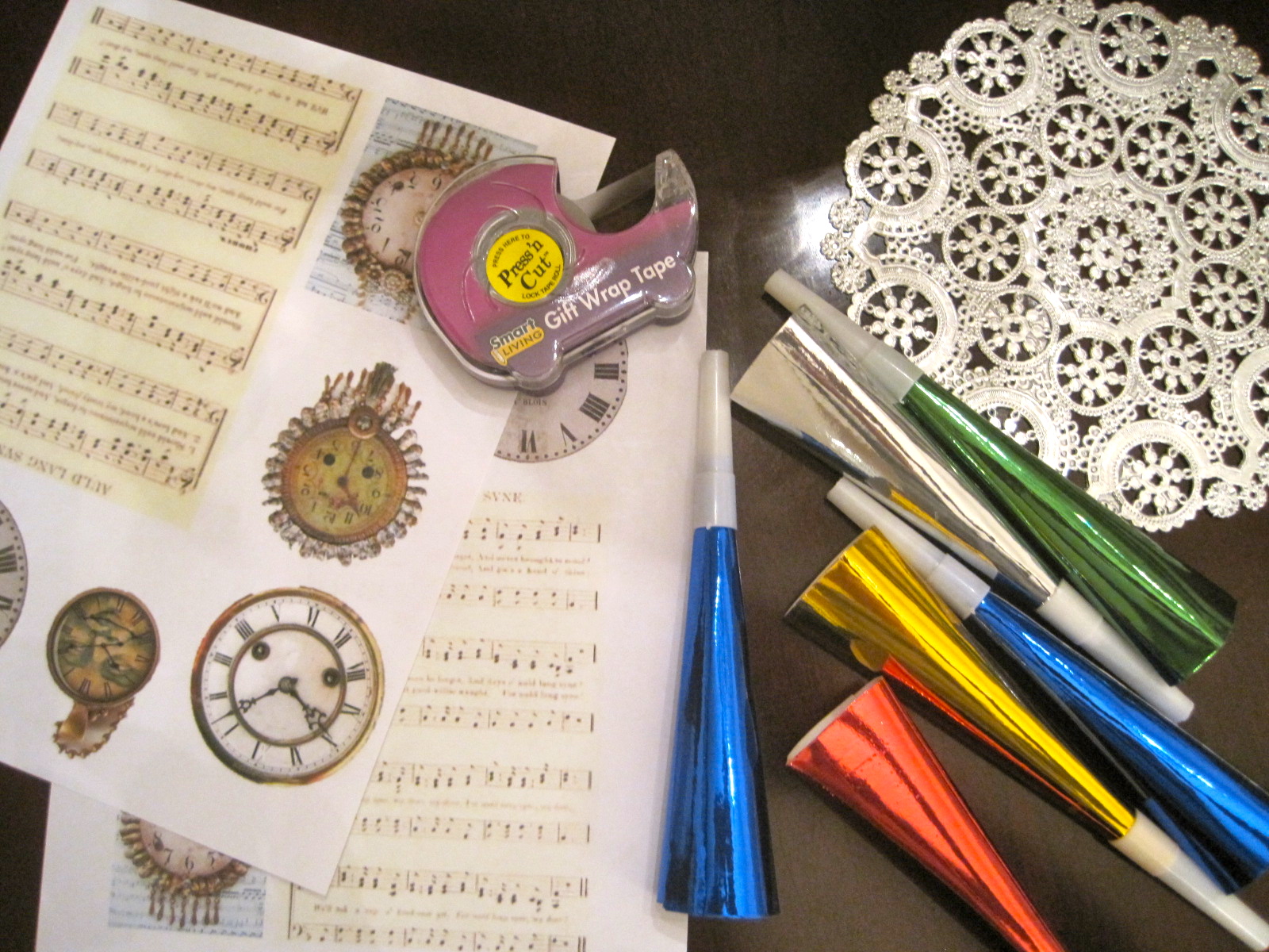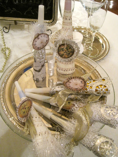 Though these noisemakers scream "party", I thought I'd give them an easy makeover to highlight the vintagey New Year's theme and toned down color scheme. I simply cut images and doilies and hot glued over the existing noisemaker, then cut out accents like the clocks and added with ribbon or tinsel accents, or whatever you have on hand.