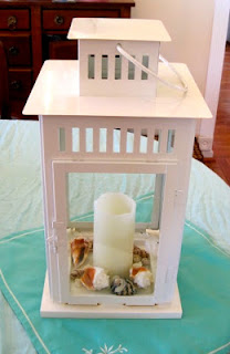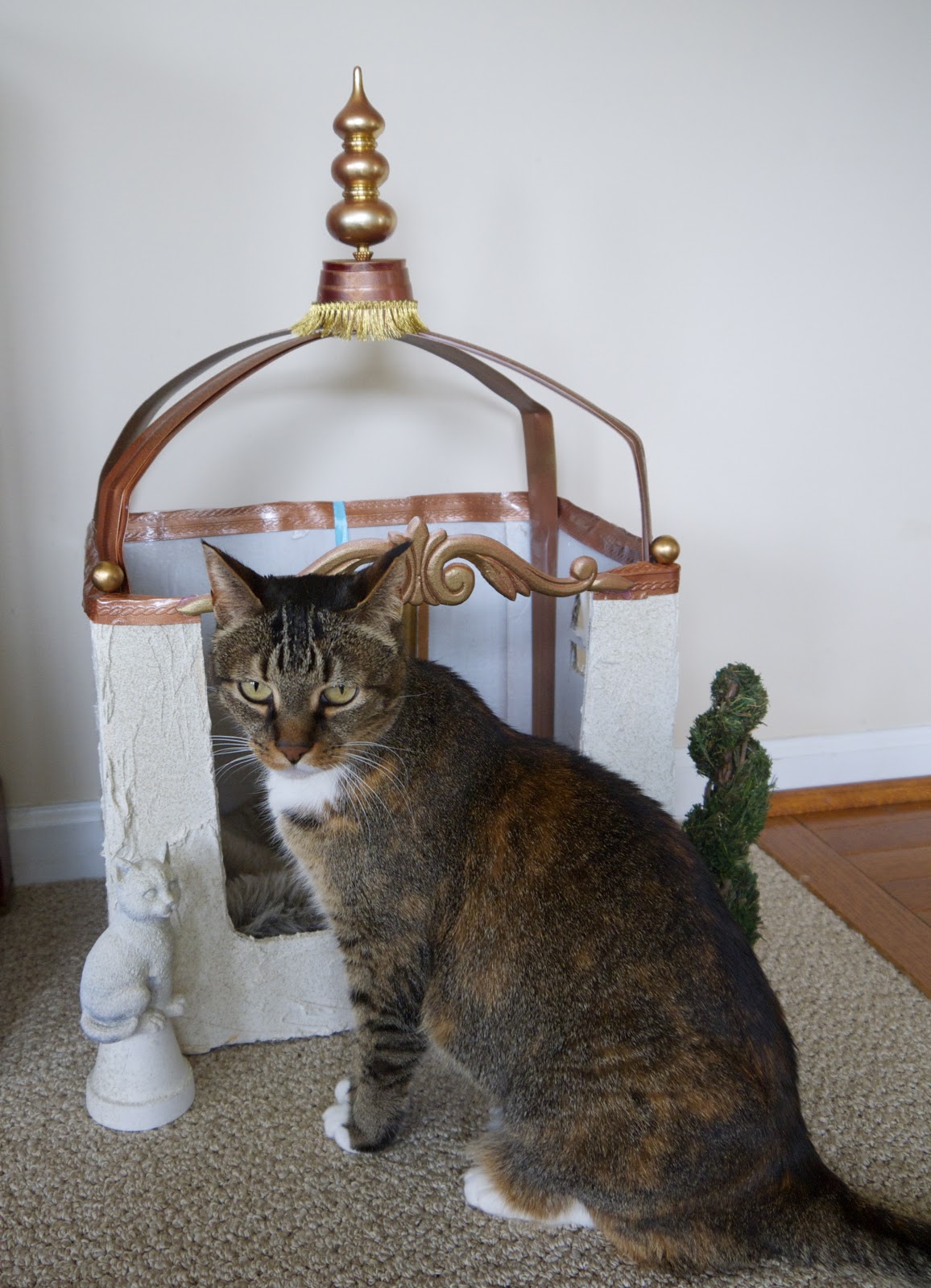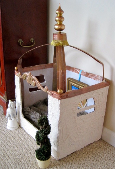 Using hot glue, I attached a spruced up plastic cup and holiday ornament finial. I also spray painted part of an old dimensional a wall paper border the same coppery color and ran it around the top with glue. Finally, I popped the wood accent over the entryway.
