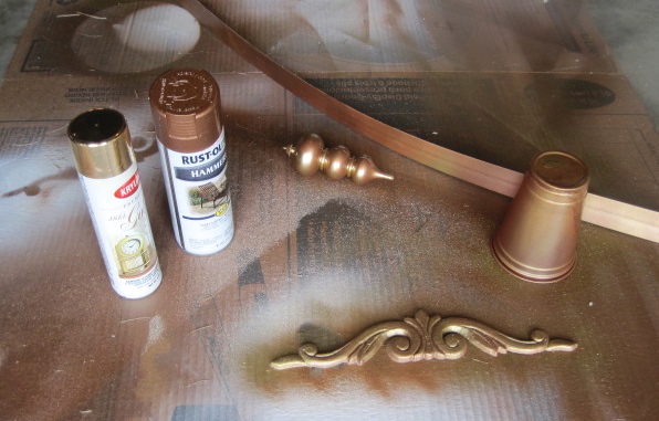 Chance of rain brought my painting projects into the makeshift studio/garage. I sprayed the moulding and finial and a plastic cup with hammered copper and gold