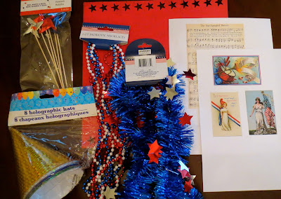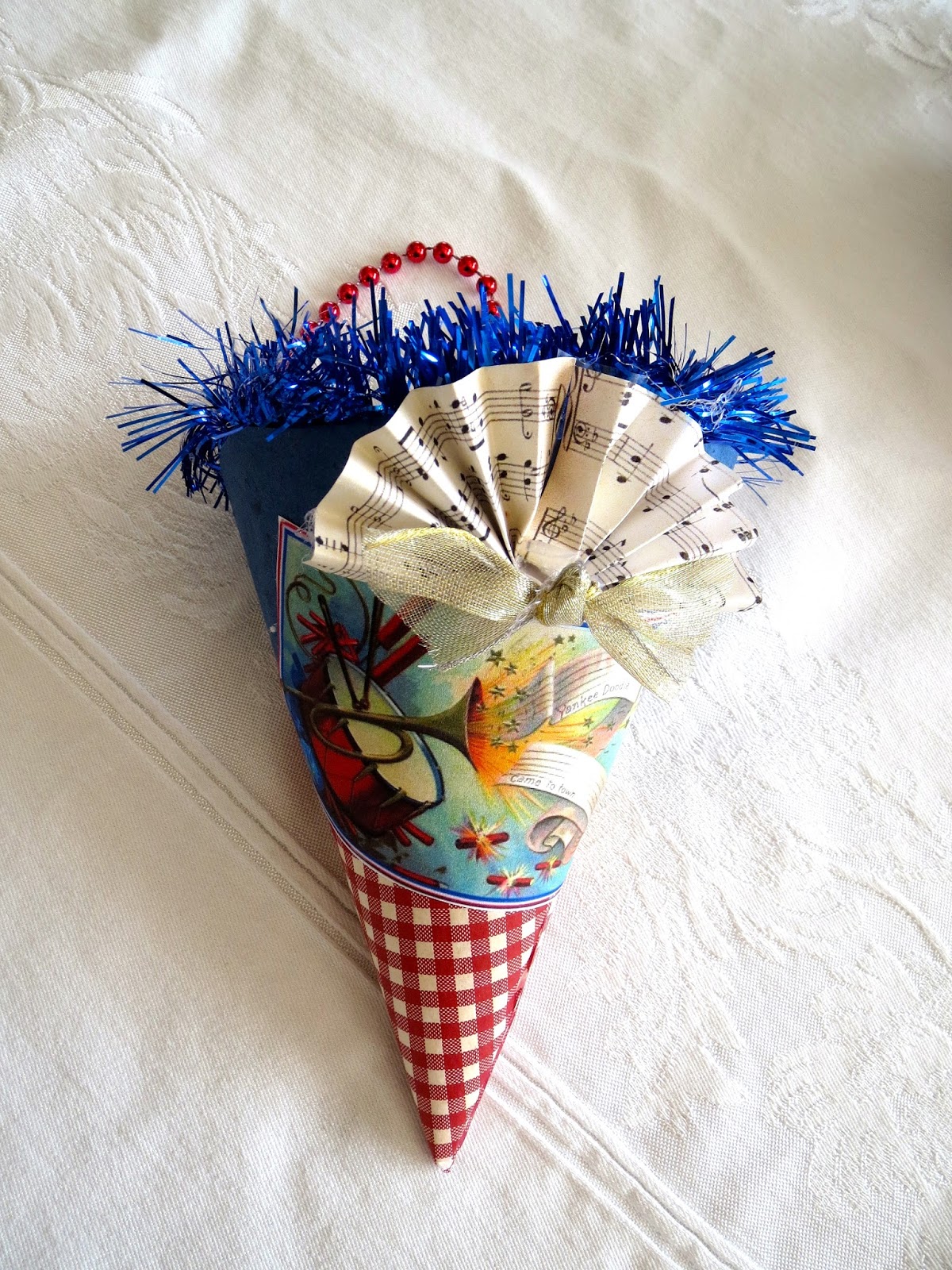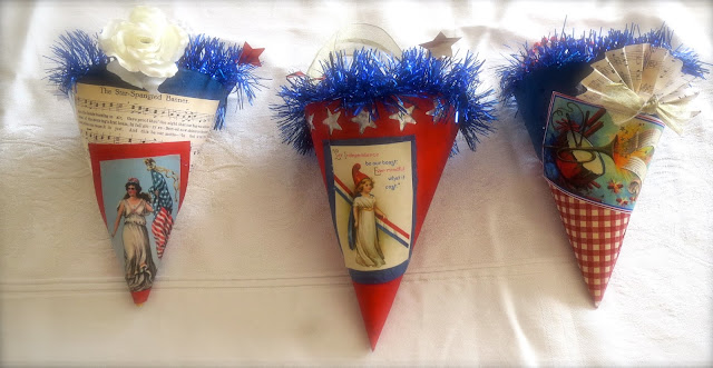 I love the idea of adapting a simple project to different occasions. Decorative paper cones are inexpensive and easy-to-make accents that can be dressed up for a variety of celebrations. Recently I created some traditional flower filled versions for my May Day post but they are also a classic adornment on Victorian Christmas trees or can be romantically decked out with lace and cupids for Valentine's Day. This year, using some vintage patriotic flare, I thought they would make fun decor for a Fourth of July picnic or perhaps filled with some small goodies and candy treats, sent home with guests as party favors.