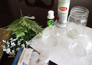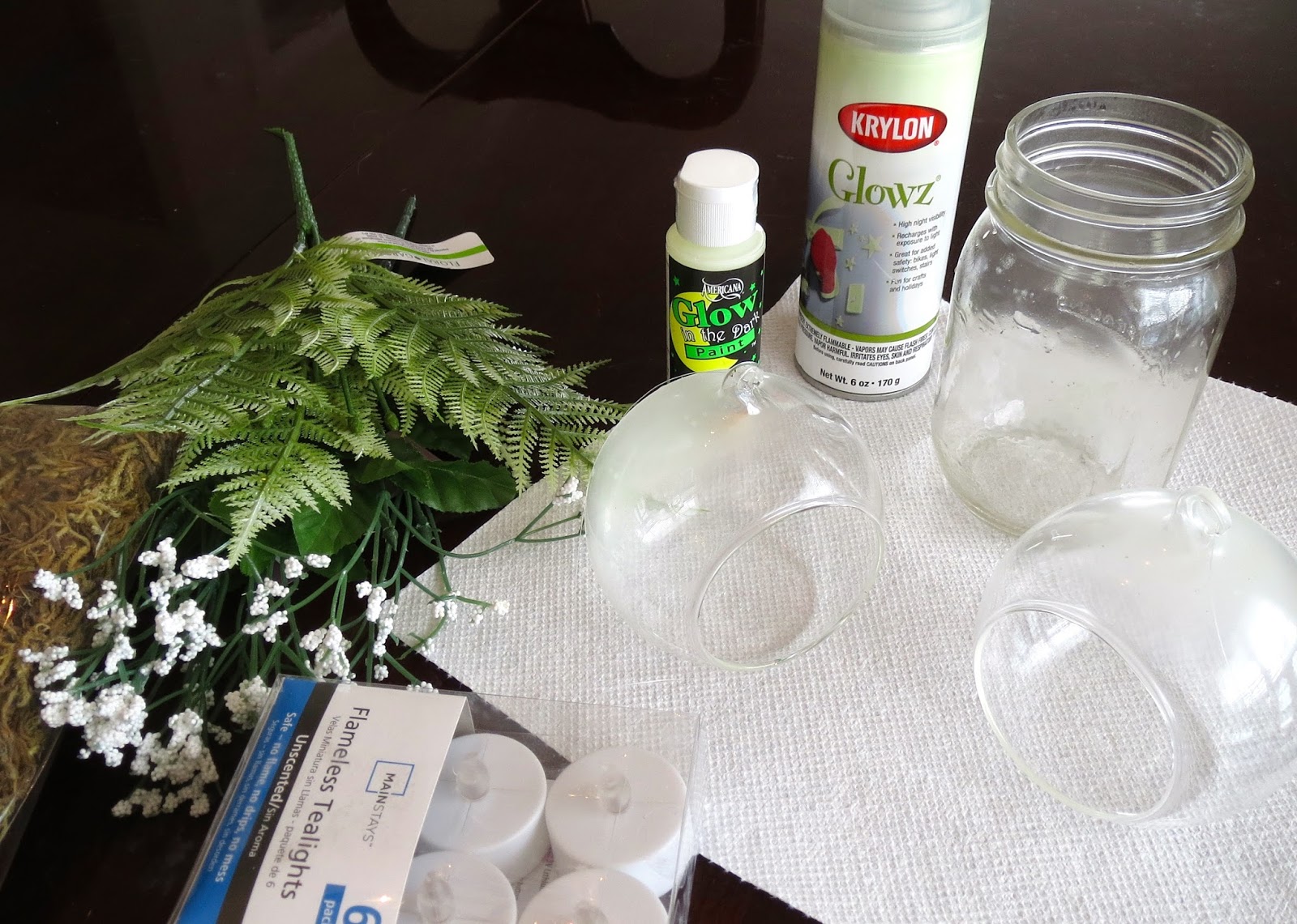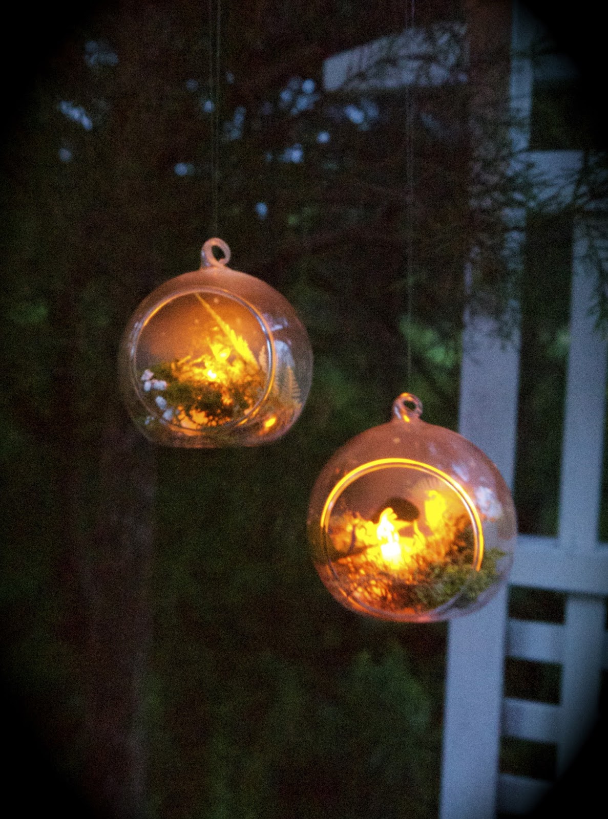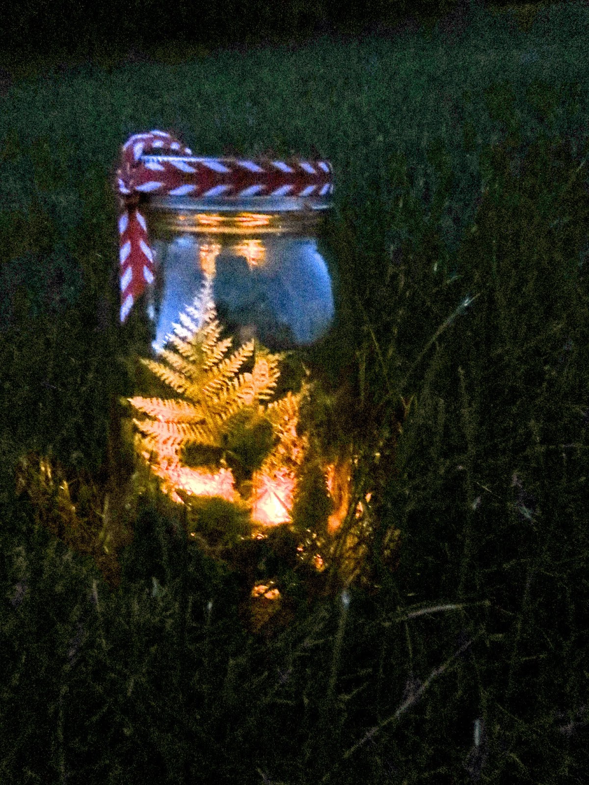 For a more traditional look, use the same process substituting a mason jar for the globes. You can add two or three votives depending on size. For authenticity, I replaced the lid liner with breathable burlap (perfect if you plan to add real fireflies to the scene) and topped with red ribbon.