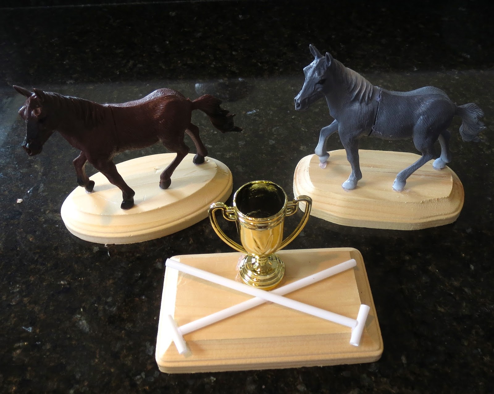 I attached ponies and plastic trophies to mini wooden plaques and fashioned two quick polo mallets from cut drinking straws