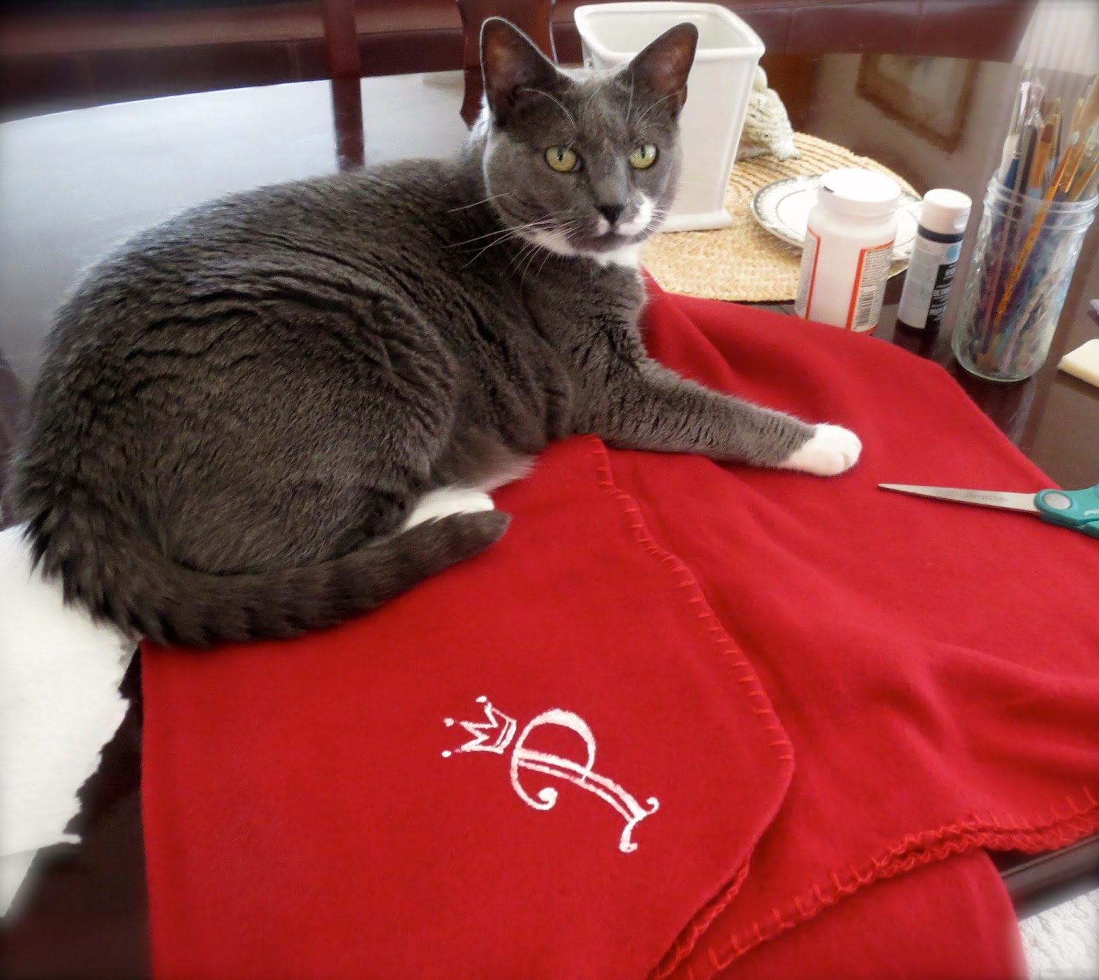 The monogram blanket is fleece ($2.88 at Walmart) with an initial and quick crown painted in white acrylic. Of course as it was drying, our furry friend decided it was for her.