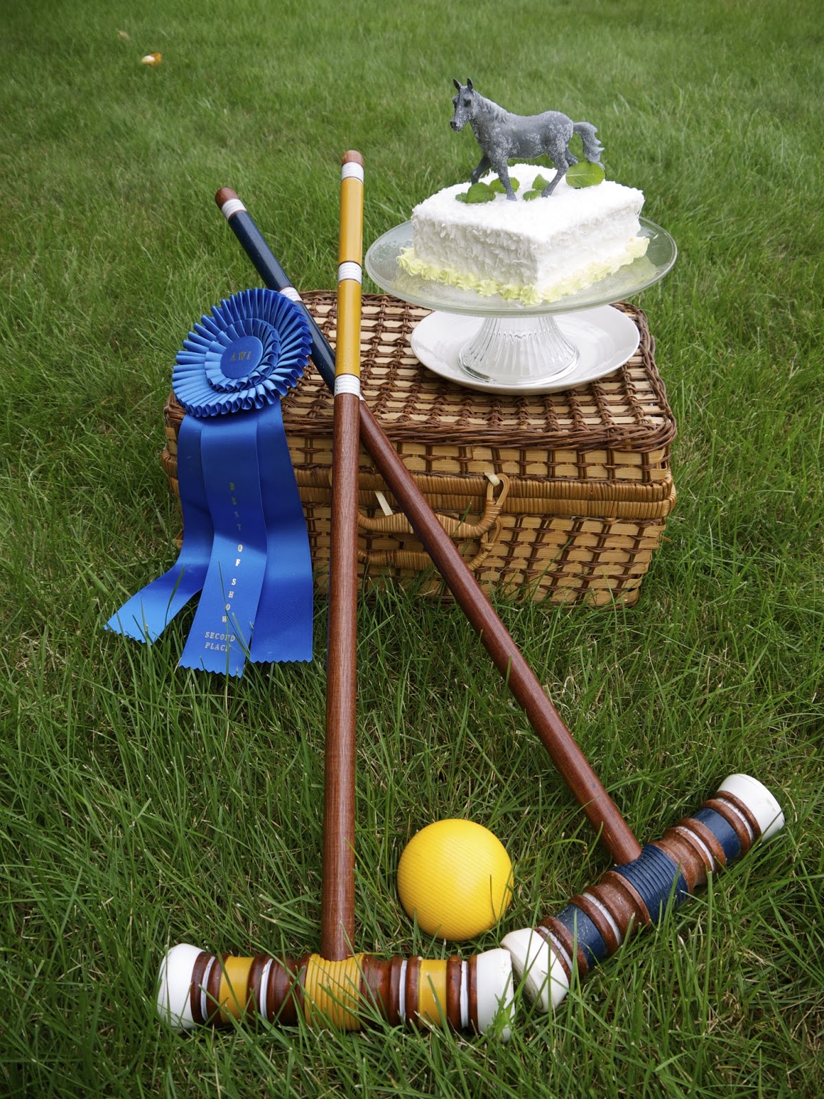 If weather or circumstance prevents a trip to the polo fields, croquet captures the spirit of the game as a fun alternative (Warning: it can get competitive) or simply use mallets as decor. The ribbon was from one of my husbands golf outings but after champagne no one would know.