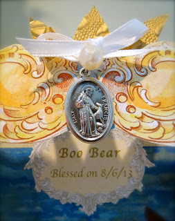 When our Boo Bear arrived one day in our yard, injured, aging and as we later discovered, deaf, we knew she was ours for keeps but she would need lots of extra TLC. Fortunately, she acclimated quickly to indoor life; she now rules the roost, demanding only certain flavors of food (salmon yes, flounder no), hogging the blankets and holding her own with four other very feisty felines. Though happy, advanced years and a rough start have brought on health problems, so I figured she'd be a good candidate for some divine intervention. Not keen on traveling, and to avoid any unnecessary trauma for all involved, I substituted her photo to be blessed in her absence.
