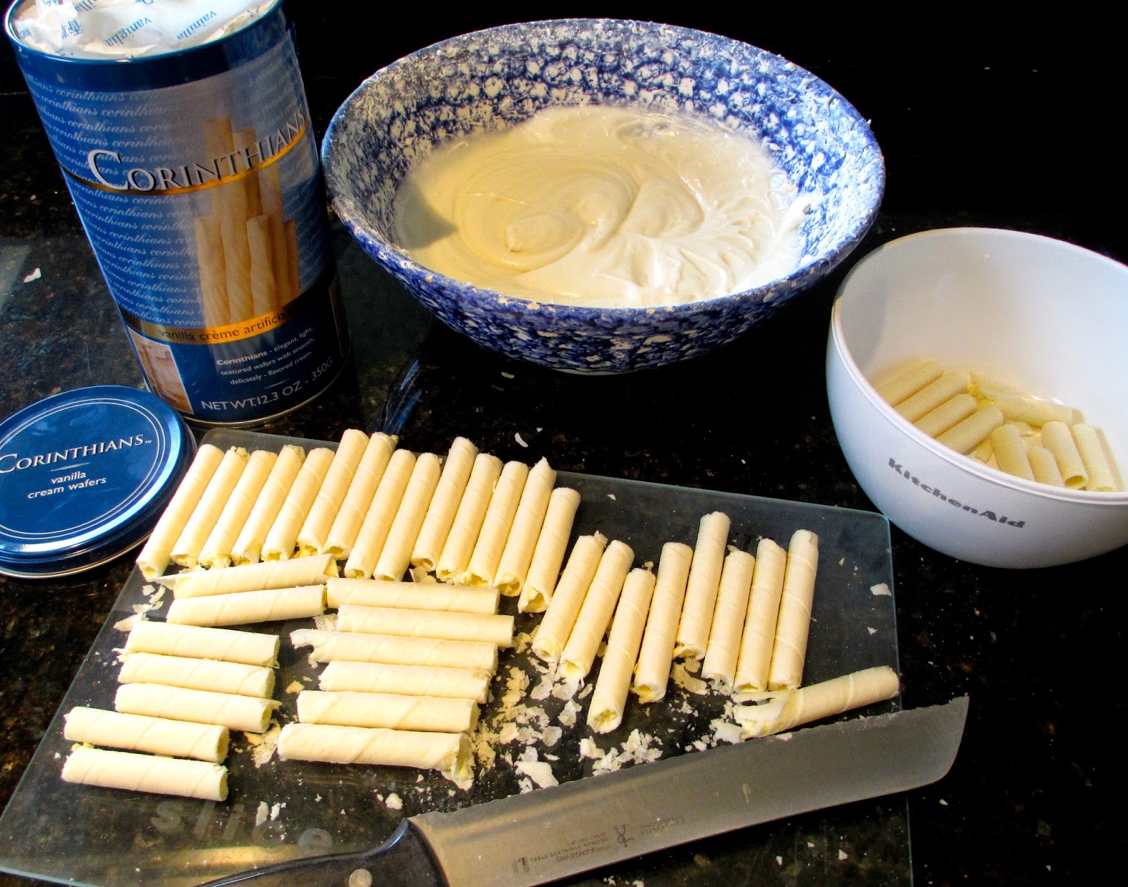Arrange pirouette cookies pressing firmly into frosting