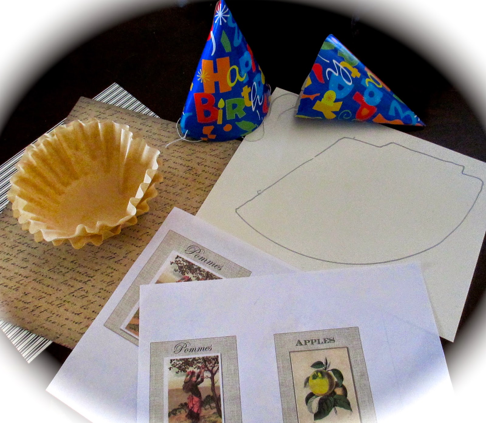Fold and secure paper into cone shape if sturdy enough or if lightweight paper place over hat for extra support. Add images or embellishments if desired with tape or hot glue. I cut the edges of  natural coffee filters and added as trim
