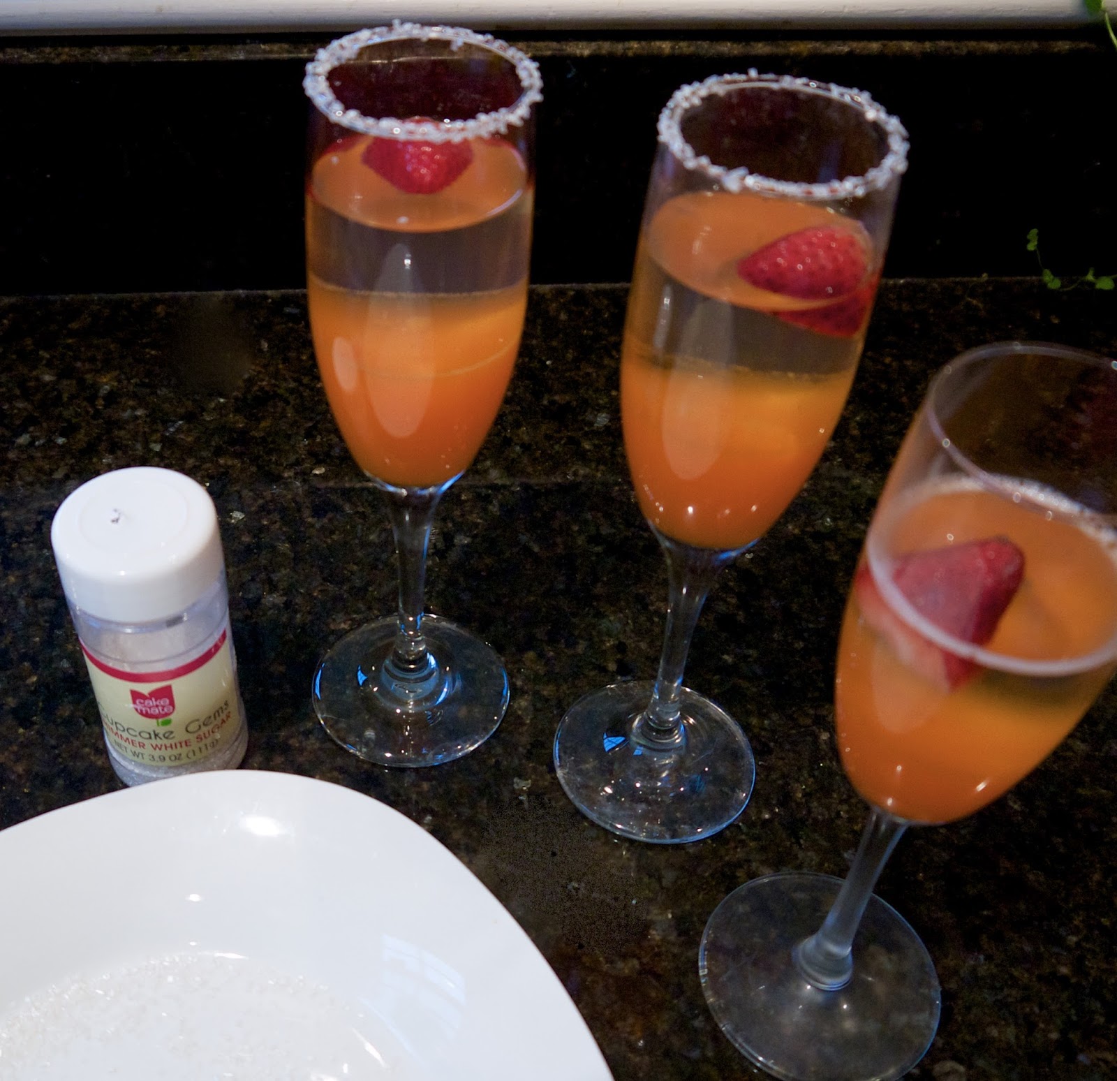 If desired, moisten the rims of the glasses and dip in sugar sprinkles. To add a bubbly foam on top, blend reserved champagne gelatin with hand mixer or whisk and spoon on top especially around inside edge of flutes where bubbles naturally form.