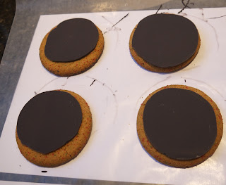 While still warm, gently press the cookies into chocolate