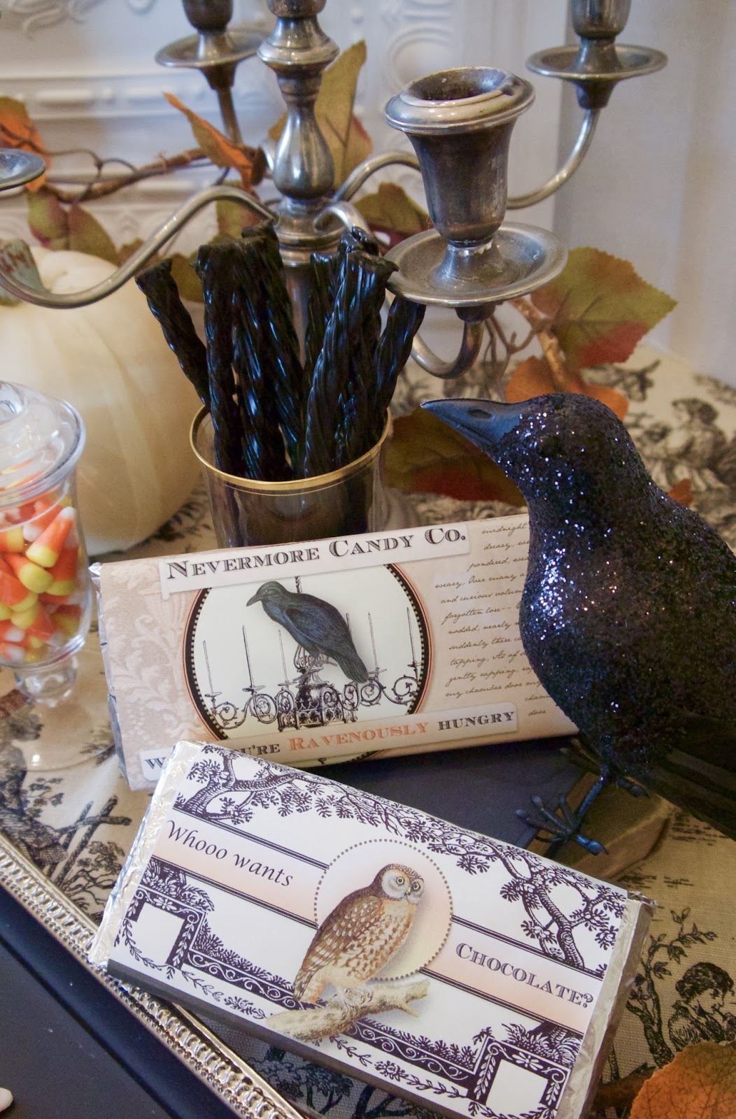 There are countless ideas and printables out there for fun and frightful DIY candy rewraps for kids of all ages to be found online, but I thought I'd try a few whimsical not-so-spooky images to lend your confections a more festive than frightening and, dare we say, more grown-up air.