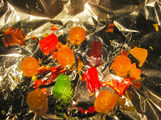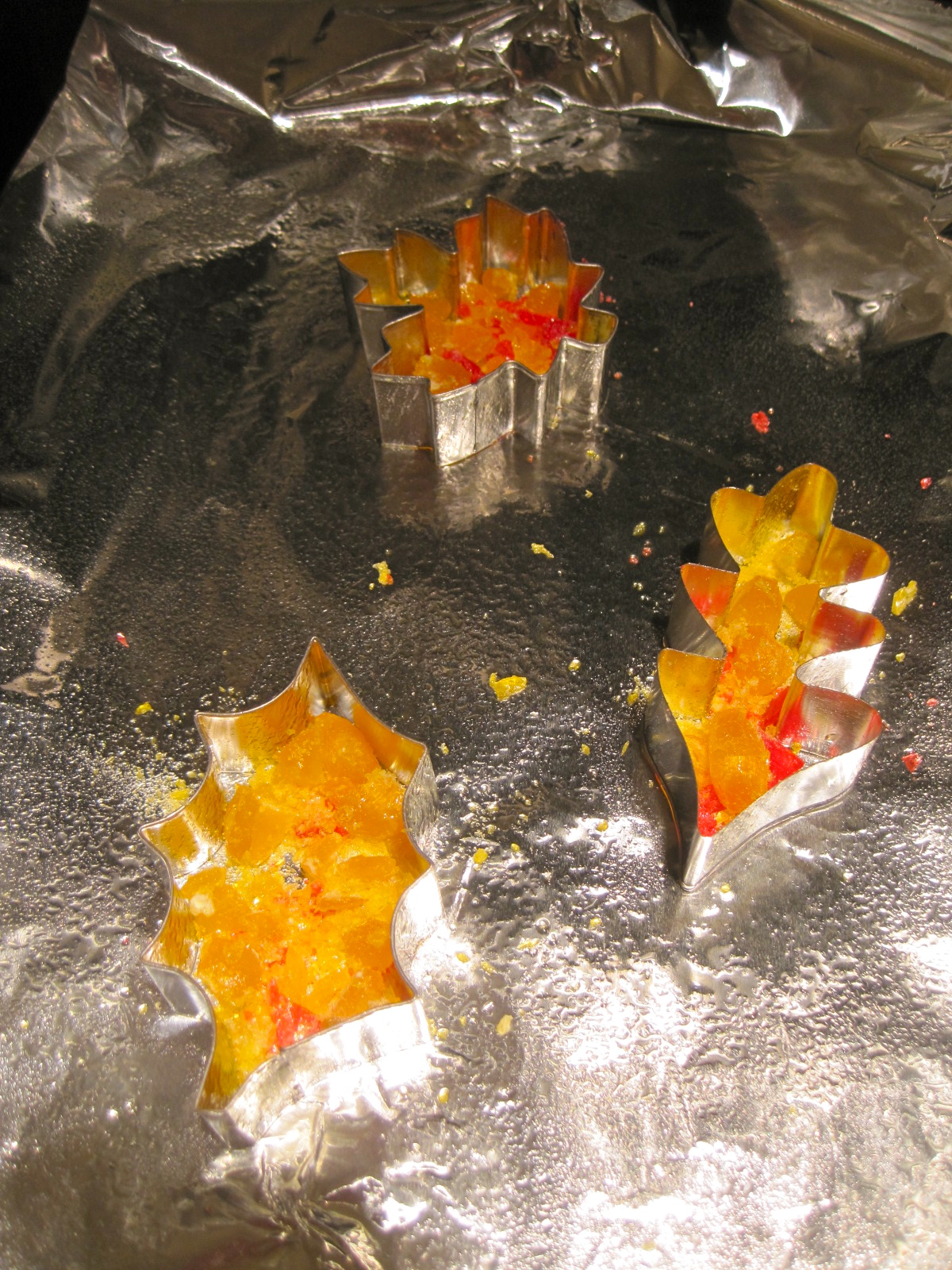 Alternately you can melt assorted unwrapped candies in the oven without cookie cutters.Once removed and the candy has cooled slightly press cookie cutters firmly into sheet of melted candy. When thoroughly cooled peel away from foil.