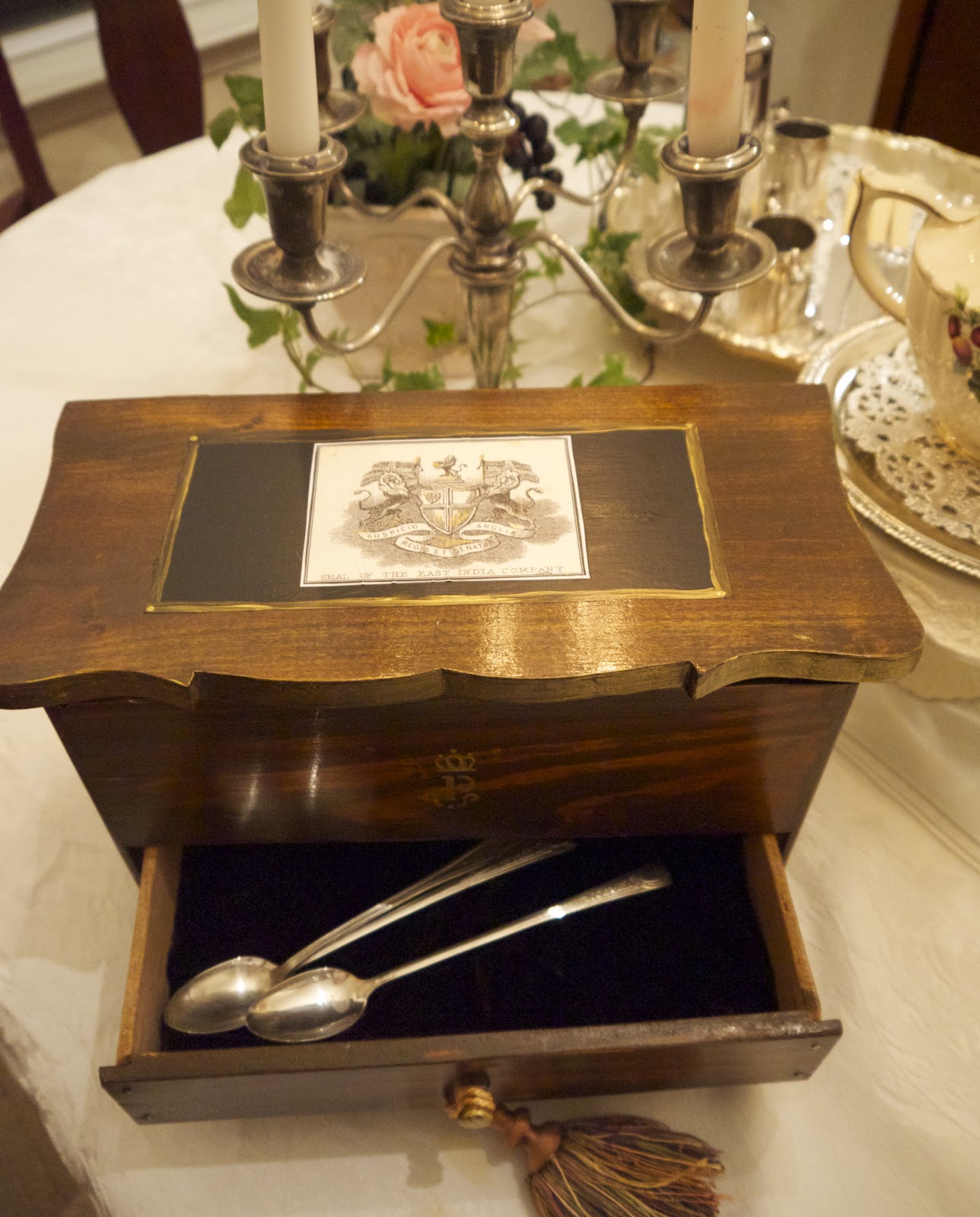 Of course tea was a prized commodity in Downton days, and every respectable household had an elegant tea caddy. You can find them in many wonderful gourmet or antique shops and online but here's a DIY version that repurposes a flea market or tag sale find on a commoner's budget.
