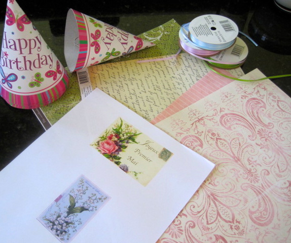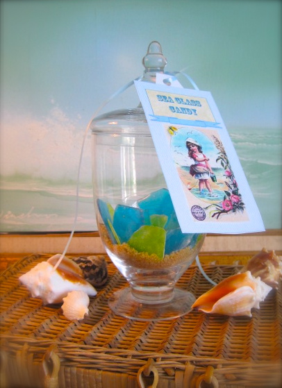 Casually mismatched china (I don't have a matching set of anything anyway) and a wicker basket gives a relaxed beachy feel. A scrap of blue lace picks up the color scheme.Sea Glass Candy