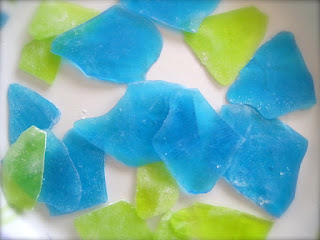 A quick internet search found countless recipes to create a sea glass candy that mimics the real thing. Some recipes call for boiling down sugar syrup but past experiences have put me off that process (yes candy thermometers can explode!) so I found a shortcut version using colored hard candy and powdered sugar.