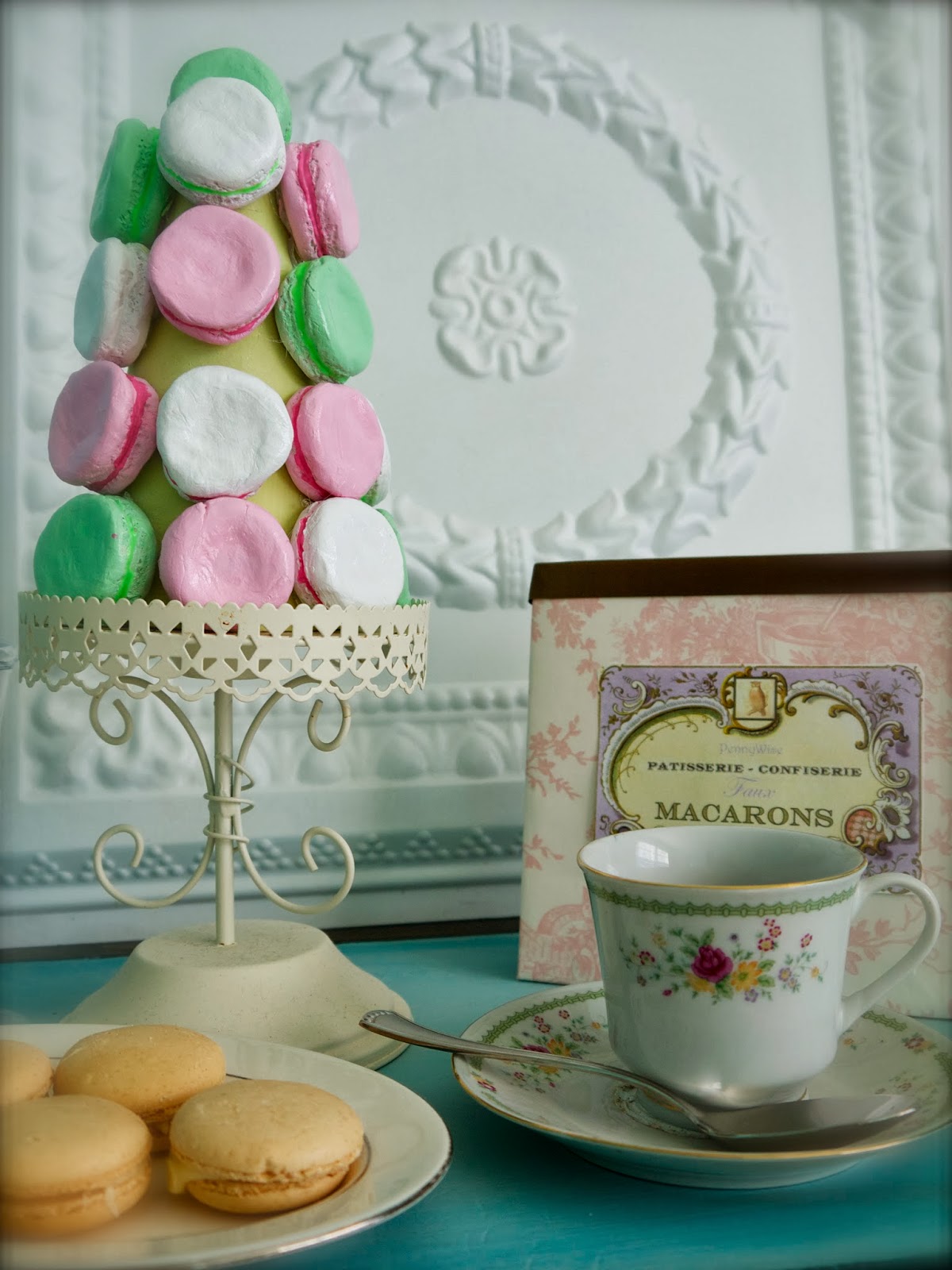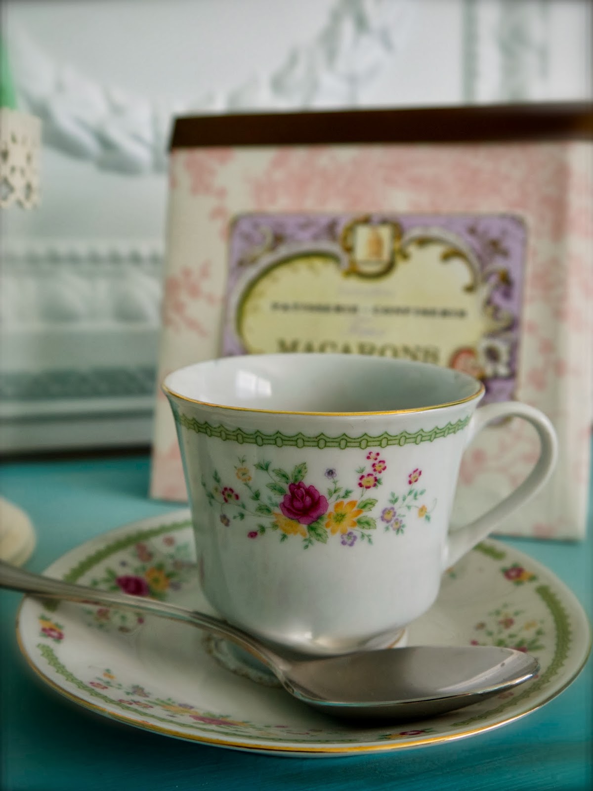 tarnished pieces from an old tea set and a rustic basket keep supplies in easy reach.