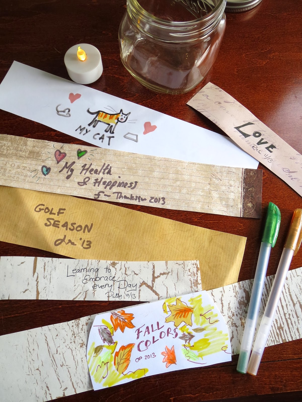 date, and a quick word or phrase on the cut paper strips or let we artsy types create an image representing something we are grateful for, anything from serious or sentimental to silly.